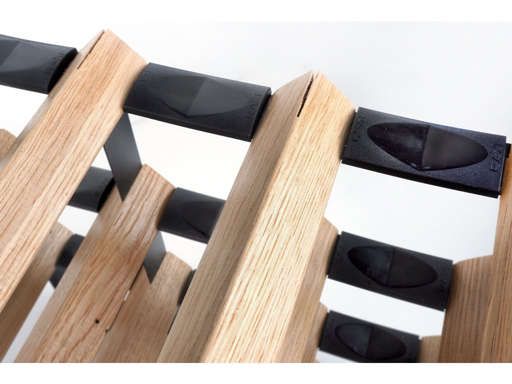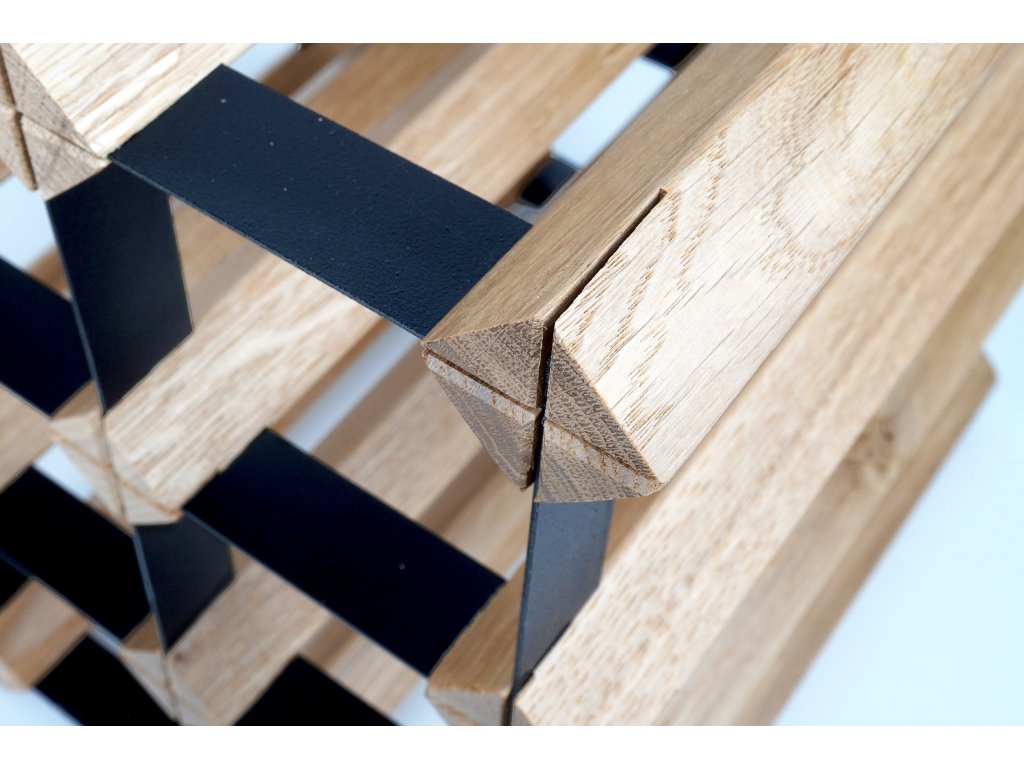 Nosné prvky stojanu jsou vyrobeny z konstrukční oceli s povrchovou úpravou práškovým lakováním v černé matné barvě. Dřevěné části jsou z masivního dubového dřeva s transparentní povrchovou úpravou, která zvýrazňuje přirozenou kresbu dřeva a chrání povrch při dlouhodobém používání. Výroba probíhá udržitelným způsobem ve střední Evropě, v České republice.